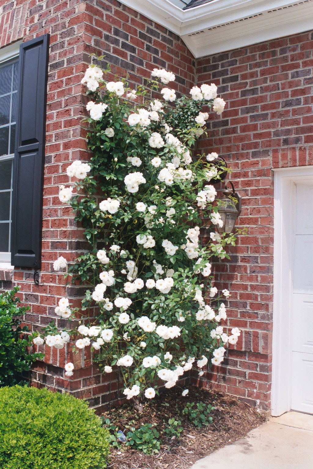| This climbing rose is held up via threading new growth behind fishing wire. The fishing wire zig-zags are held in place with masonry screws (TapCons) into the mortar. The success of this plant is from weekly Miracle-Grow application as well as weekly removal of old blooms. Placement on the South facing brick wall allowed the hot bricks to continue to warm the plant through the evening. Remember to cut right above the next leaf down for best growth patterns. |